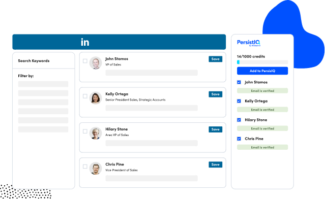 Build targeted prospect lists quickly using PersistIQ’s Chrome Extension. Search for prospects on LinkedIn (and LinkedIn Sales Navigator), find their email, and automatically add them to your outreach campaigns using PersistIQ’s Chrome Extension.